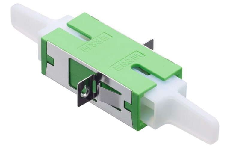 SC adapter with semi-transparent dust caps. Quick mounting clip integrated. M2 nuts pre-mounted.