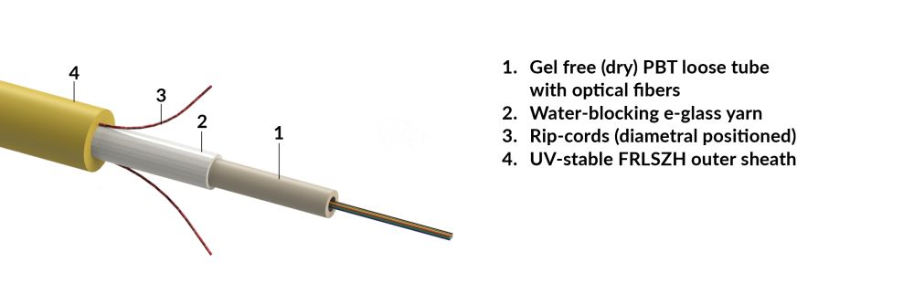 Central loose tube, gel-free cable, iRP-increased rodent protected, universal-use, UV.FRLSZH sheath - yellow, Cca, 01 x 04 fibers G657A1 (R870424)