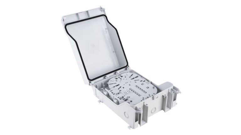 Polaris-box 16 with external mounting points equipped with a swiveling fiber inlay. On the top side adapter field for up to (12)/24 adapter (LC-D), SC or E-2000. On the back side splice area for up to 2 spliceprotectors 12 x crimp (ANT) or 12 x shrink (HS). Additional fiber storage are below the fiber inlay.