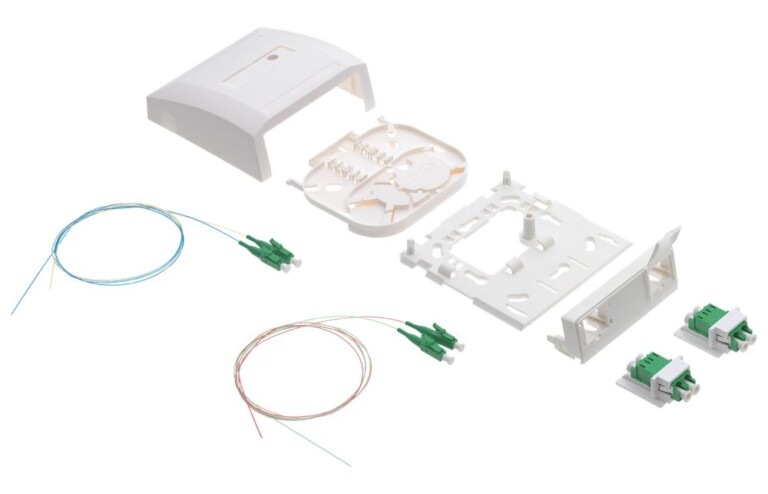 Ready for splicing with 2 LC-Duplex adapters (with integrated self-closing metal laser protection flaps), 4 LC pigtails included. Splice tray with splice holder and strain relief for 600 µm fibers.